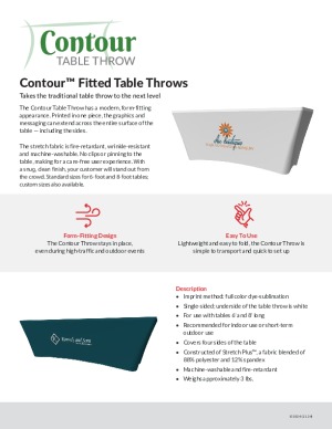 Contour 6 ft. Table ThrowTake the traditional table throw to the next level. The Countour Table Throw has a modern, form-fitting appearance. Printed in one piece, the graphics and messaging can extend across the entire surface of the table -- including the sides.